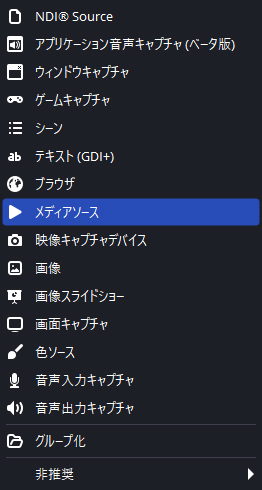 OBSの「ソース」の+ボタンから「メディアソース」を選択します。