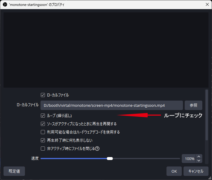 そのシーンのソースにstarting soonの動画素材を+ボタンで追加しておきます。