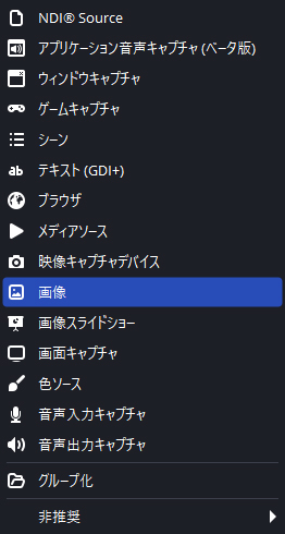 静止画は「ソース」の+ボタンから「画像」を選択します。