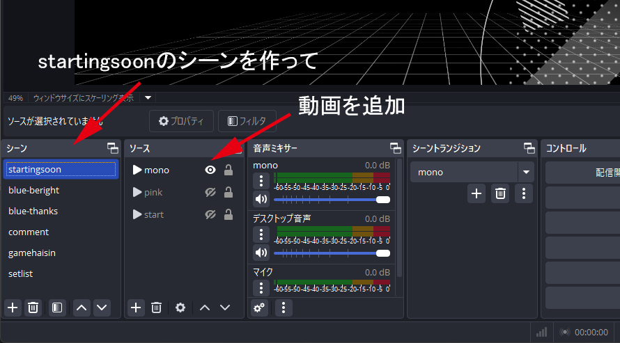 まず待機画面用のシーン(ここではstartingsoon)を作成します。