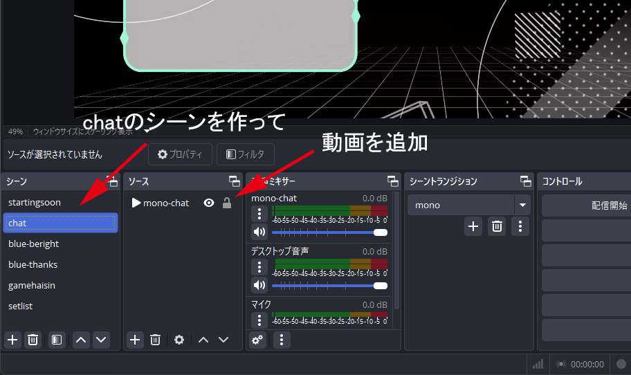 そのシーンのソースにチャット画面の動画素材を+ボタンで追加しておきます。